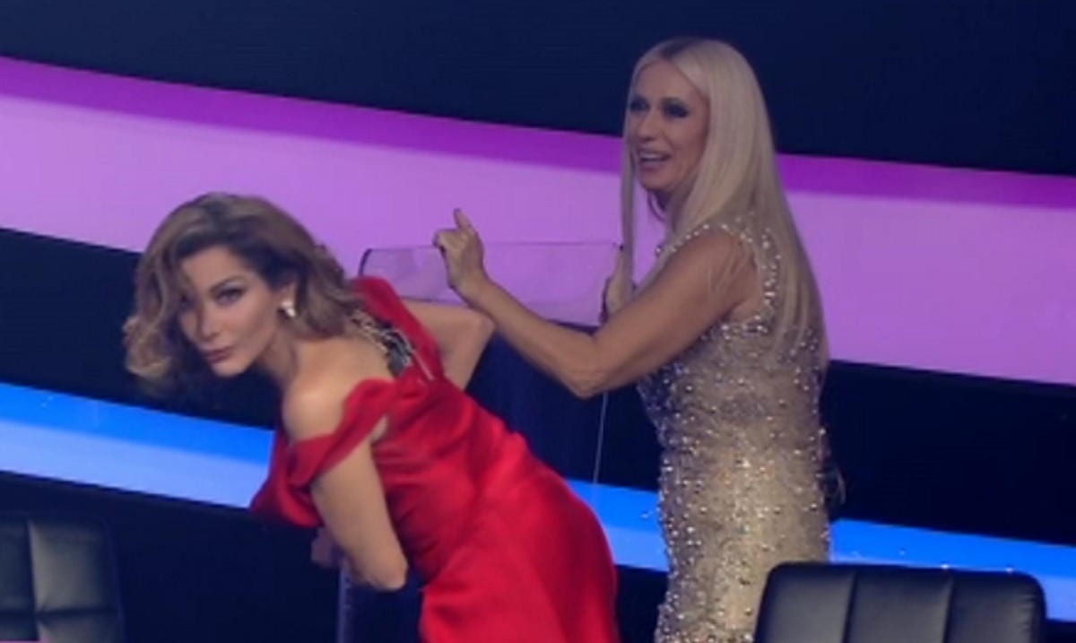 Συγκεκριμένα η Δέσποινα Βανδή κι η Μαρία Μπακοδήμου φαίνεται να ενθουσιάστηκαν τόσο, που με τις έντονες κινήσεις τους έριξαν το plexiglass που υπάρχει ανάμεσά τους. Ξαφνικά το πλάνο γυρνά στην κριτική επιτροπή αλλά οι δυο τους δεν ήταν στην θέση τους αφού προσπαθούσαν να το στερεώσουν ξανά στην θέση του.