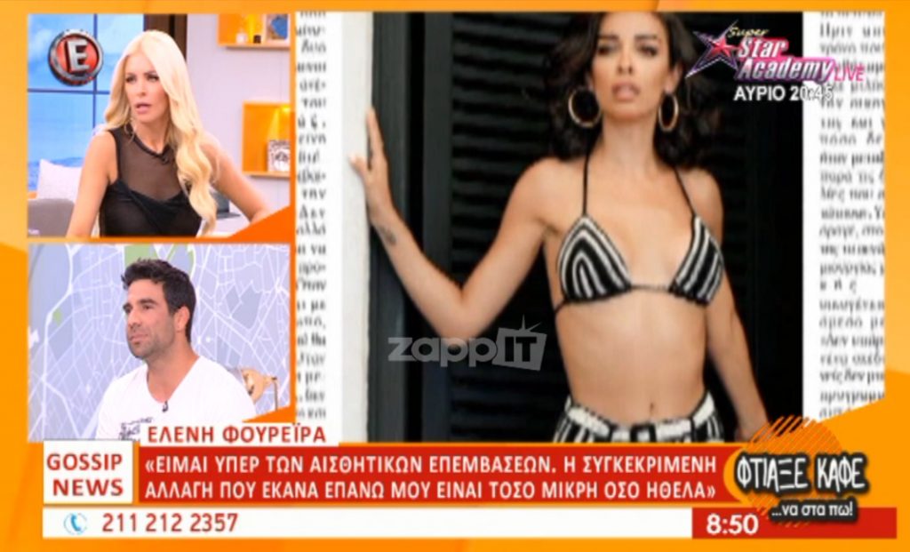 Η Ελένη Φουρέιρα βρίσκεται στο εξώφυλλο του People που κυκλοφορεί αυτή την Κυριακή και τα σχόλια στην εκπομπή Φτιάξε καφέ να στα πω ήταν πολλά… «Με γεια! Με γεια!» αναφώνησε η Ειρήνη Γκανιάτσου. Ο ενθουσιασμός της δημοσιογράφου ήταν για το στήθος της τραγουδίστριας. Η Κατερίνα Καινούργιου διαχώρισε τη θέση της, όμως όταν άκουσε την εξομολόγηση της Ελένης Φουρέιρα για τις αισθητικές επεμβάσεις, μίλησε για τη δική της αισθητική επέμβαση, αλλά και για την παρεξήγηση με την τραγουδίστρια την περίοδο… Γιώργου Σαμαρά.