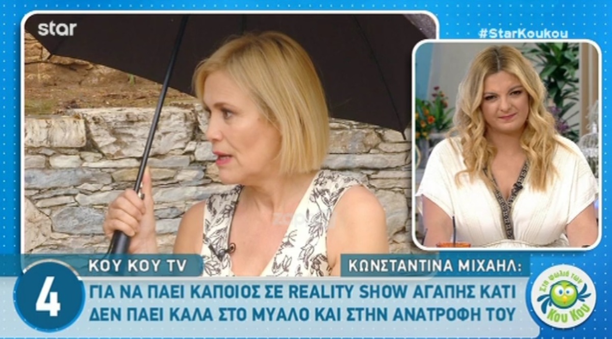Συνέντευξη κάτω από τη βροχή έδωσε η Κωνσταντίνα Μιχαήλ Στη Φωλιά των Κου Κου και στη Δήμητρα Καλφούντζου. Η ηθοποιός αναφέρθηκε στις πλαστικές επεμβάσεις δηλώνοντας πως η ίδια δεν θέλει να γίνει «δούλος της ένεσης», ενώ δηλώνει πως πλέον έχει αποφασίσει να μην εκθέτει την προσωπική της ζωή. Μεταξύ άλλων η Κωνσταντίνα Μιχαήλ αναφέρθηκε και στα ριάλιτι αγάπης, αλλά και τη φίλη της Μαρία Μπακοδήμου που παρουσιάζει το Power of Love.