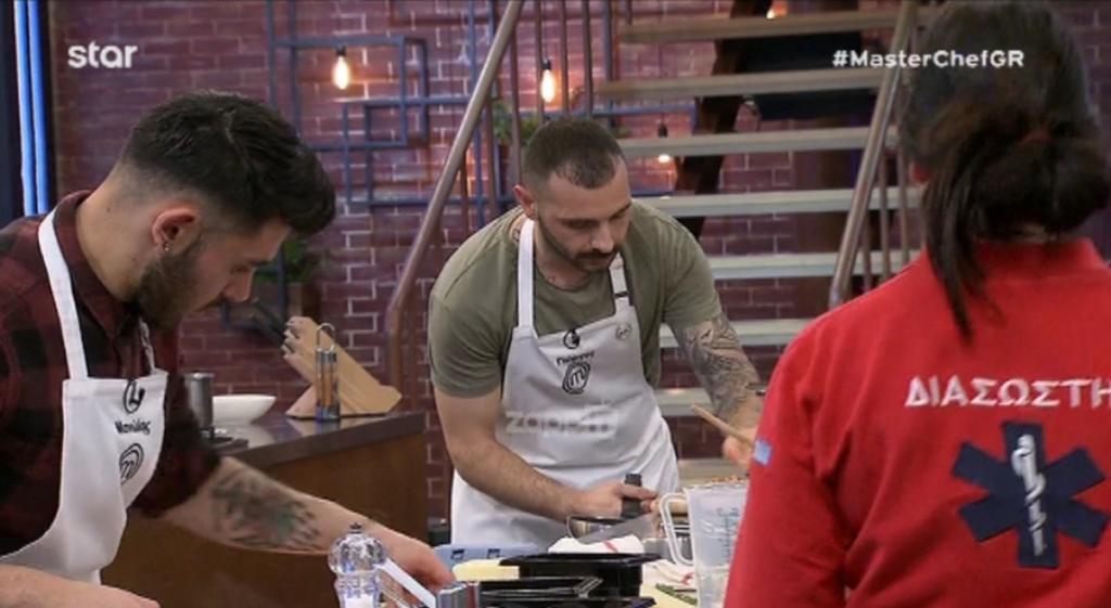 Ο διαγωνιζόμενος δεν πρόσεξε και κόπηκε στο δάχτυλο με το μαχαίρι με αποτέλεσμα να αρχίσει να πετάει τα… γαλλικά το ένα μετά το άλλο.