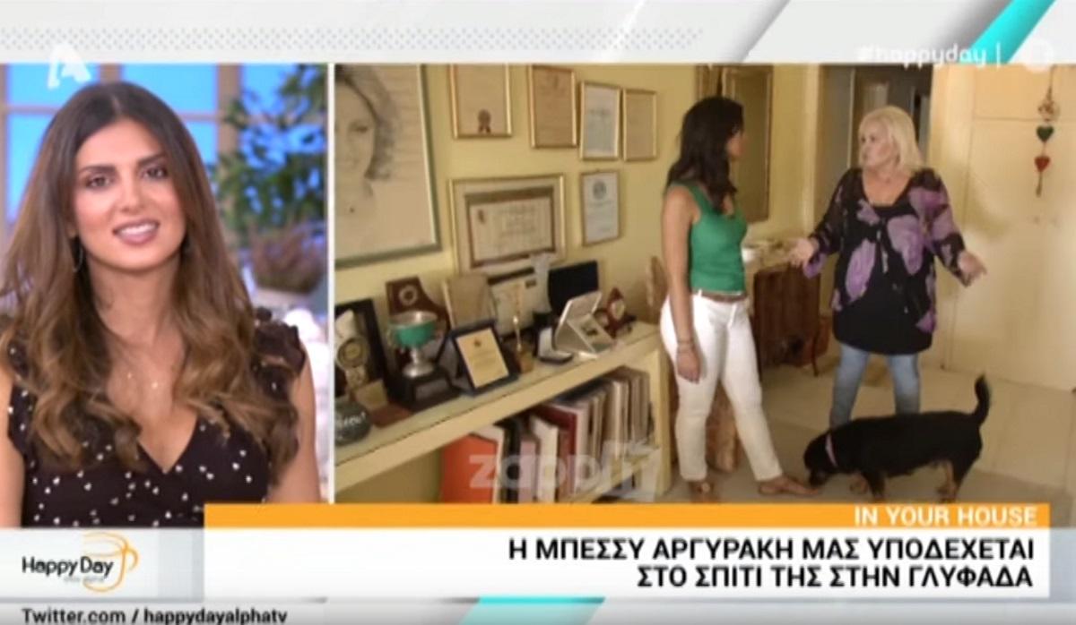 Την κάμερα του Happy Day και την δημοσιογράφο Ελένη Μουστάκη υποδέχθηκε η Μπέσσυ Αργυράκη στο σπίτι της στην Γλυφάδα. Η τραγουδίστρια μίλησε, μέσα σε όλα, για την γνωριμία με τον αγαπημένο της σκύλο ενώ μας ξενάγησε σε όμορφες γωνιές του σπιτιού της.