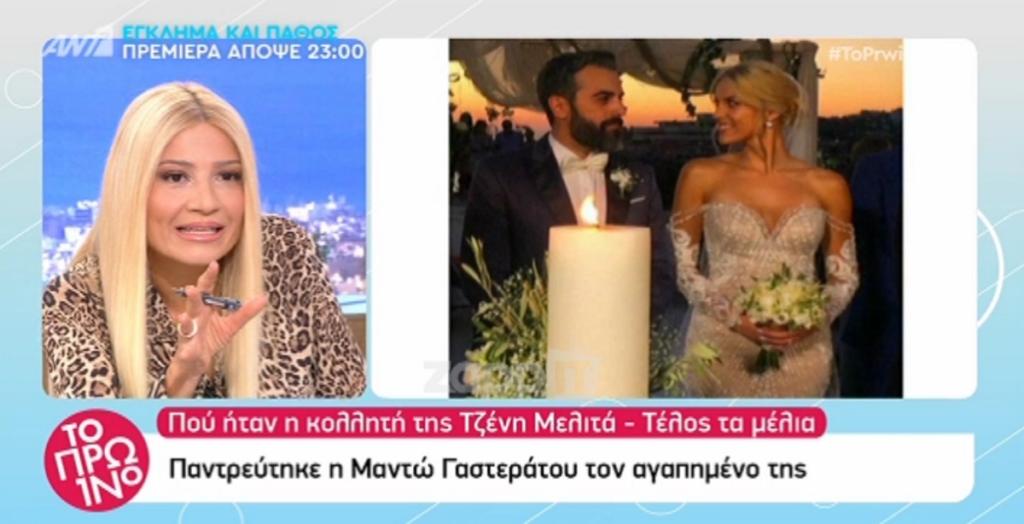 Η Μαντώ Γαστεράτου και ο αγαπημένος της Νίκος ενώθηκαν με ιερά δεσμά του γάμου και όσοι βρέθηκαν στο πλάι τους πέρασαν μια υπέροχη βραδιά. Όσοι βρέθηκαν… Γιατί η φίλη και κολλητή της, τουλάχιστον όπως είχαμε δει στην τηλεόραση τα προηγούμενα χρόνια, Τζένη Μελιτά, έλαμψε δια της απουσίας της.