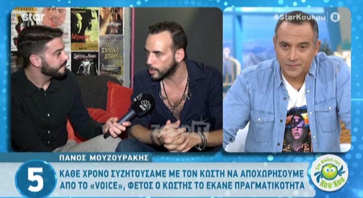 “Για μένα το The Voice είναι η στιγμή χαλάρωσης”, δήλωσε στην κάμερα της Φωλιάς των Κου Κου ο Πάνος Μουζουράκης. Ωστόσο, όταν ο Ισίδωρος Φίκαρης τον ρώτησε αν έχει σκεφτεί ποτέ να σταματήσει, ο Πάνος Μουζουράκης εξομολογήθηκε για πρώτη φορά πως: