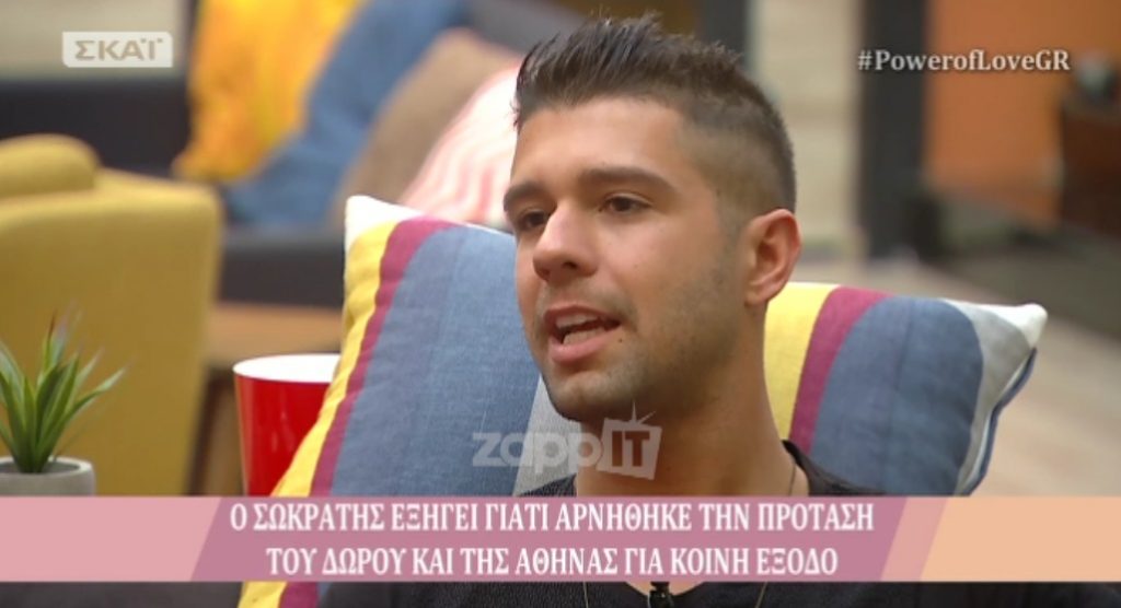 Η Αθηνά πήρε τον λόγο και είπε: “Θα λέγαμε τον Παναγιώτη και την Άννα αλλά επειδή ο Σωκράτης με την Κυριακή δεν έχουν βγει ποτέ έξω, θα πούμε Σωκράτη και Κυριακή”. Τι ήταν να το ακούσει ο Σωκράτης; Η αντίδρασή του ήταν άμεση: “Νιώθω ότι το κάνουν από λύπηση και δεν μου αρέσει τώρα αυτό. Προτιμώ να πάνε μόνοι τους ή να πάρουν μαζί τους ένα άλλο ζευγάρι”. Αυτό φόρτισε αρνητικά την ατμόσφαιρα και περισσότερο τον Δώρο, ο οποίος είπε να πάρουν μαζί τους, τελικά, τον Παναγιώτη και την Άννα.