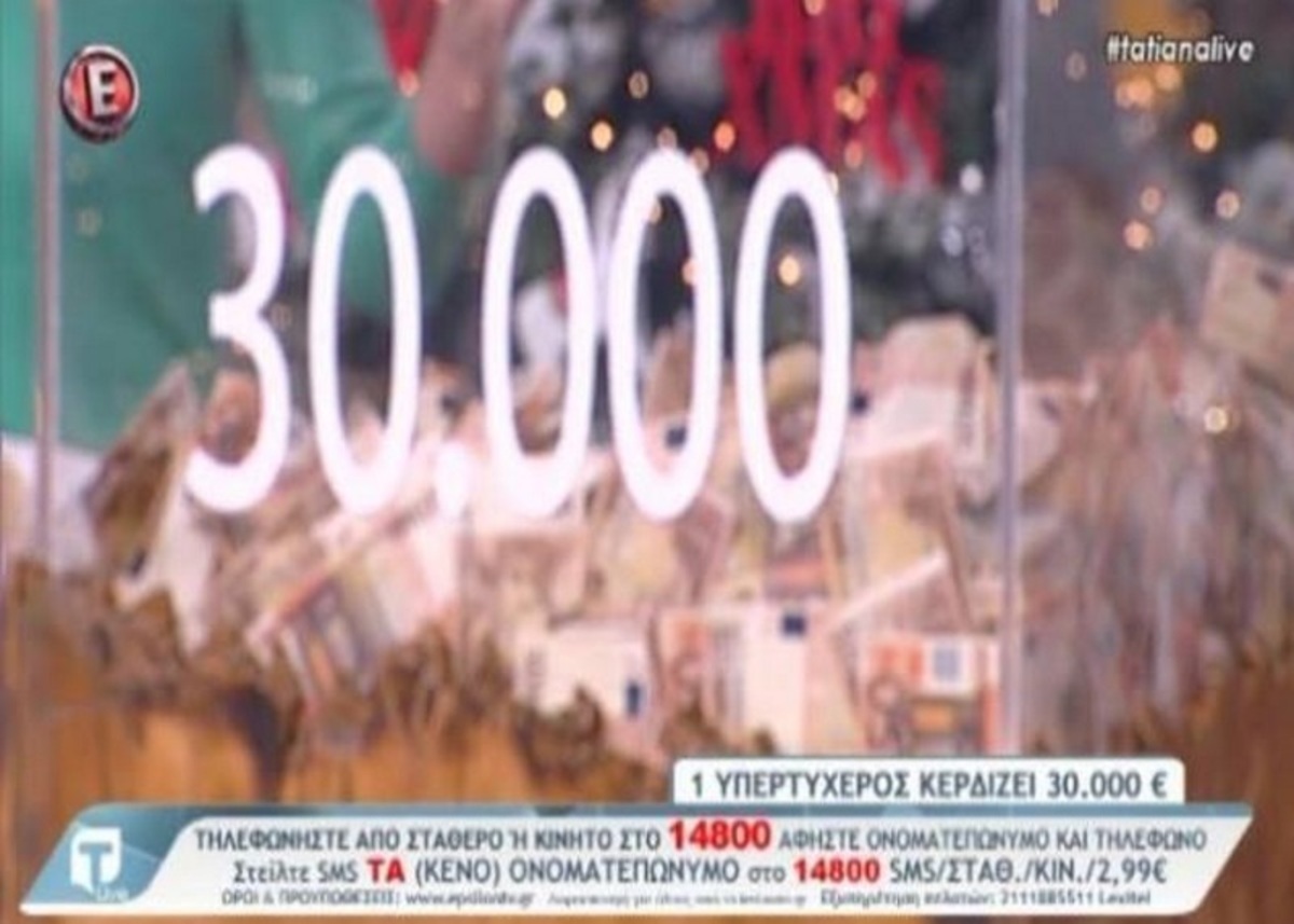 Σήμερα η μεγάλη κλήρωση για τα 30.000 ευρώ στην εκπομπή Tatiana Live της Τατιάνας Στεφανίδου. Προλαβαίνεις και εσύ να μπεις τώρα στην κλήρωση και να διεκδικήσεις το χρηματικό πόσο των 30.000 ευρώ από την εκπομπή Tatiana Live για να κάνεις την Πρωτοχρονιά… των ονείρων σου.