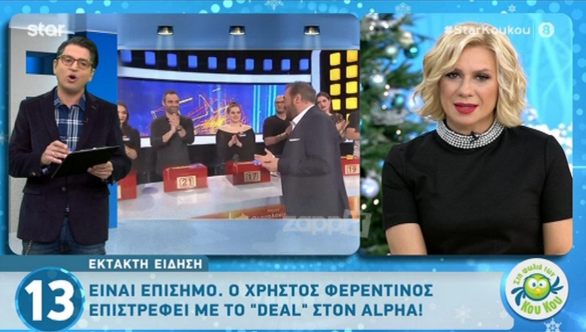 Μια ευχάριστη είδηση για τη συνέχιση της συνεργασίας του Χρήστου Φερεντίνου με τον Alpha παρουσίασε ο δημοσιογράφος Γιάννης Πουλόπουλος στη Φωλιά των Κου Κου. Είδηση που αφορά στην επιστροφή του αγαπημένου Deal τις πρώτες μέρες του νέου έτους.