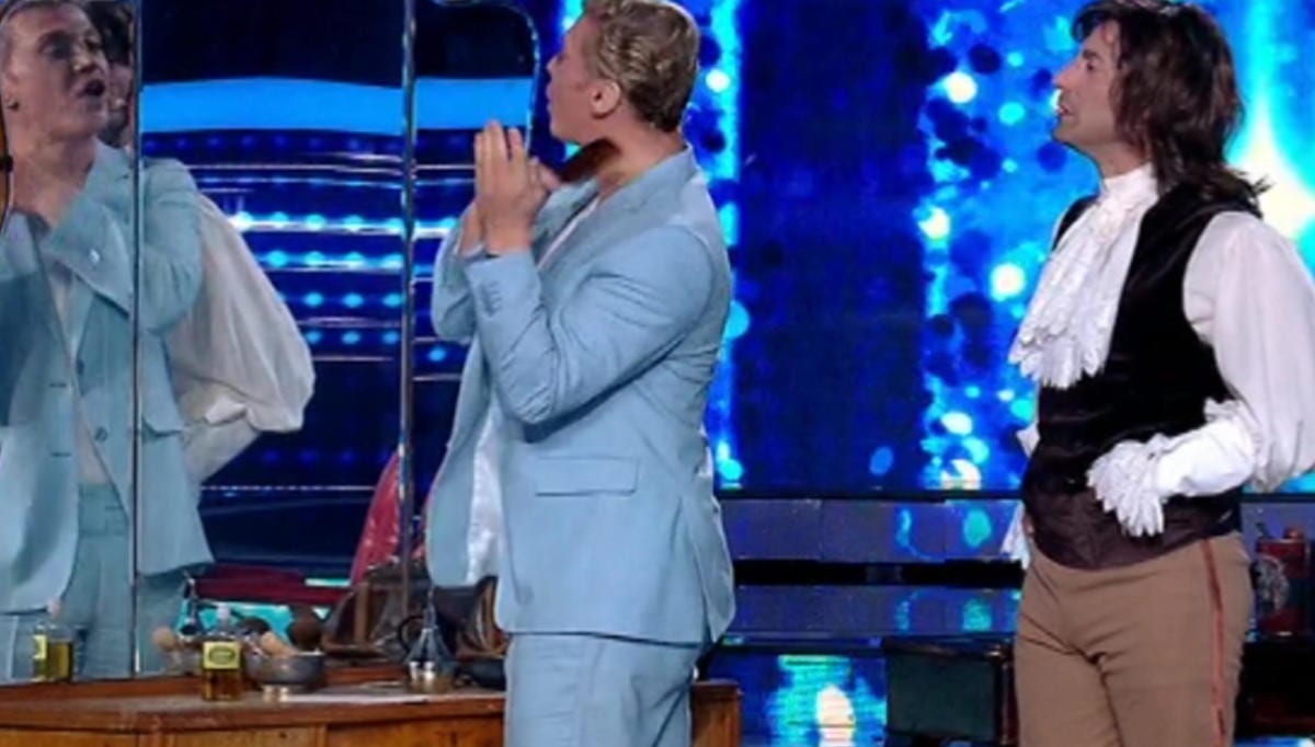Αυτό συνέβη και με την περίπτωση του Λευτέρη Ελευθερίου, που μεταμφιέστηκε στον Κουρέα της Σεβίλλης. Ο Τάκης, αφού λύθηκε στα γέλια κι υποκλίθηκε στο ταλέντο του, είχε και μία άλλη οπτική για το θέαμα που είδε. Ο καθρέφτης του έφερε στον μυαλό σκηνές με την Μυρσίνη και τον Δούκα Σεβαστό από τις Άγριες Μέλισσες. Μάλιστα πήγε στην σκηνή και πήρε το αυταρχικό κι επιβλητικό ύφος της Μυρσίνης, που εκτοξεύει προσβολές για τις αδελφές Σταμίρη, με το αποτέλεσμα να είναι τουλάχιστον ξεκαρδιστικό.