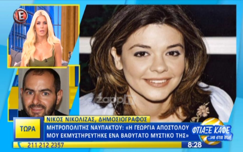 Ο μητροπολίτης Ναυπάκτου κ. Ἱερόθεος, αποκαλύπτει άγνωστες πτυχές από τη ζωή της ηθοποιού Γεωργίας Αποστόλου, μέσα από ένα εκτενές κείμενό του. Όπως αποκάλυψε στην εκπομπή Φτιάξε καφέ να στα πω ο δημοσιογράφος Νίκος Νικόλιζας, η Γεωργία Αποστόλου είχε ένα μεγάλο μυστικό το οποίο πριν φύγει από τη ζωή το εκμυστηρεύτηκε στον μητροπολίτη.