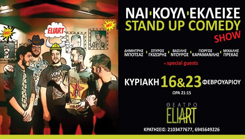 Μετά από λαϊκή απαίτηση η κωμική ομάδα ΝαιΚουλΈκλεισε επιστρέφει στο Θέατρο ELIART τις Κυριακές 16 και 23 Φεβρουαρίου, για ένα καταπληκτικό Stand Up Comedy Show που θα αφήσει εποχή! Το χειμώνα.